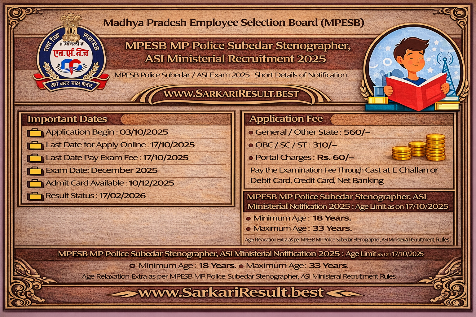 - MPESB MP Police Subedar Stenographer, ASI Ministerial Recruitment for Various Post Candidate Can Apply Between 03/10/2025 to 17/10/2025