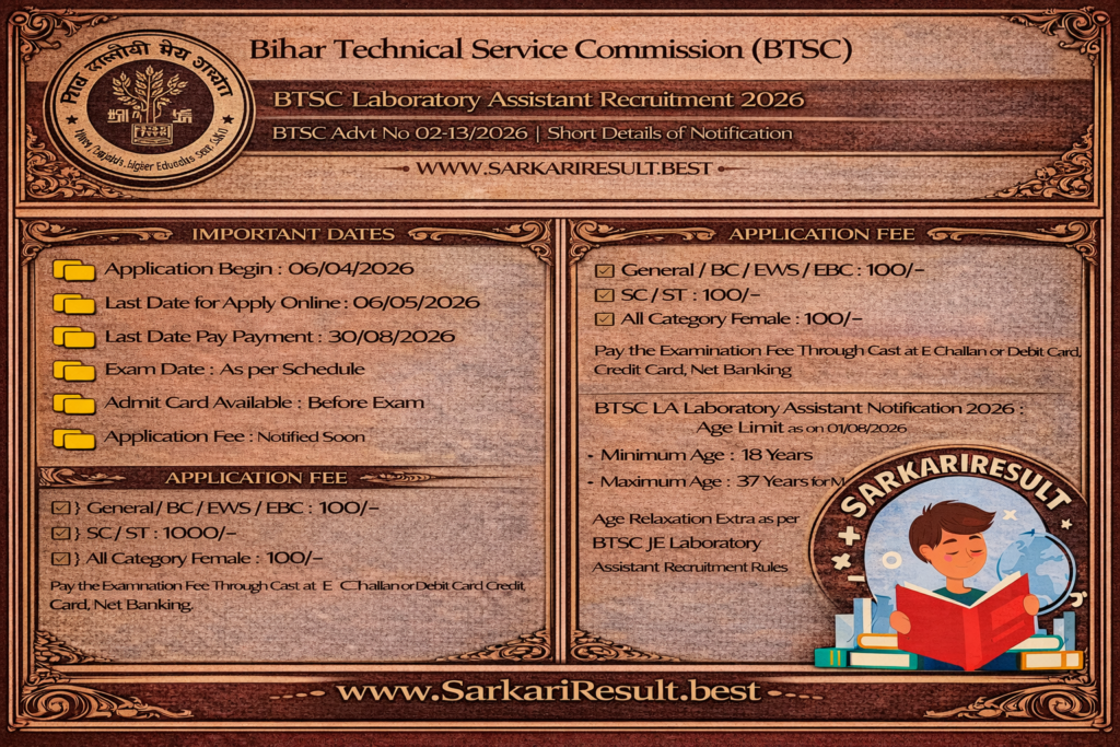 • For the latest updates on Sarkari Result,ย admit card, answer key, and result, always visit SarkariResult.com, the official website for Sarkari Result in India (Since 2012).BTSC Laboratory Assistant Recruitment 2026