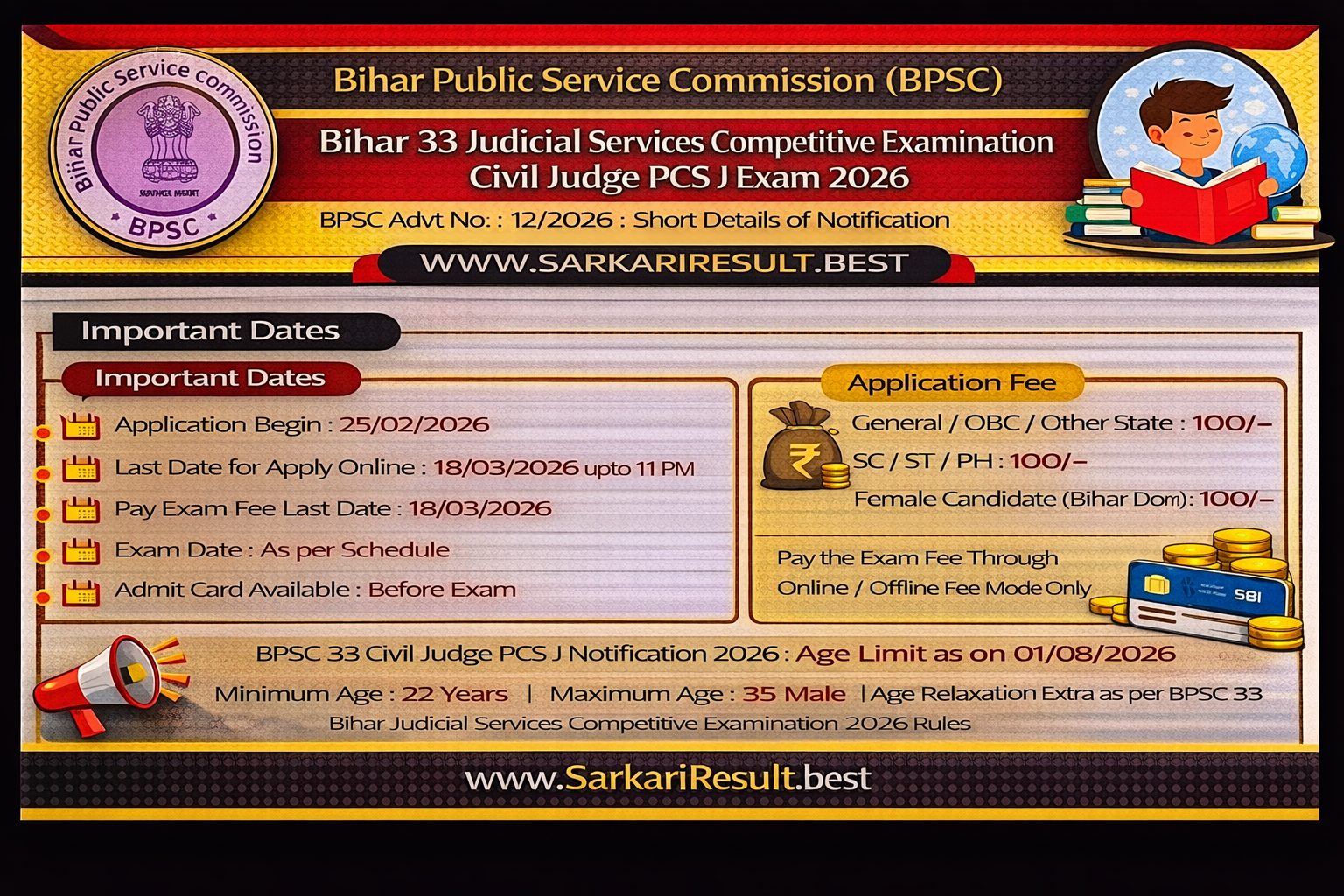 • Age Relaxation Extra as per BPSC 33 Bihar Judicial Services Competitive Examination 2026 Rules.