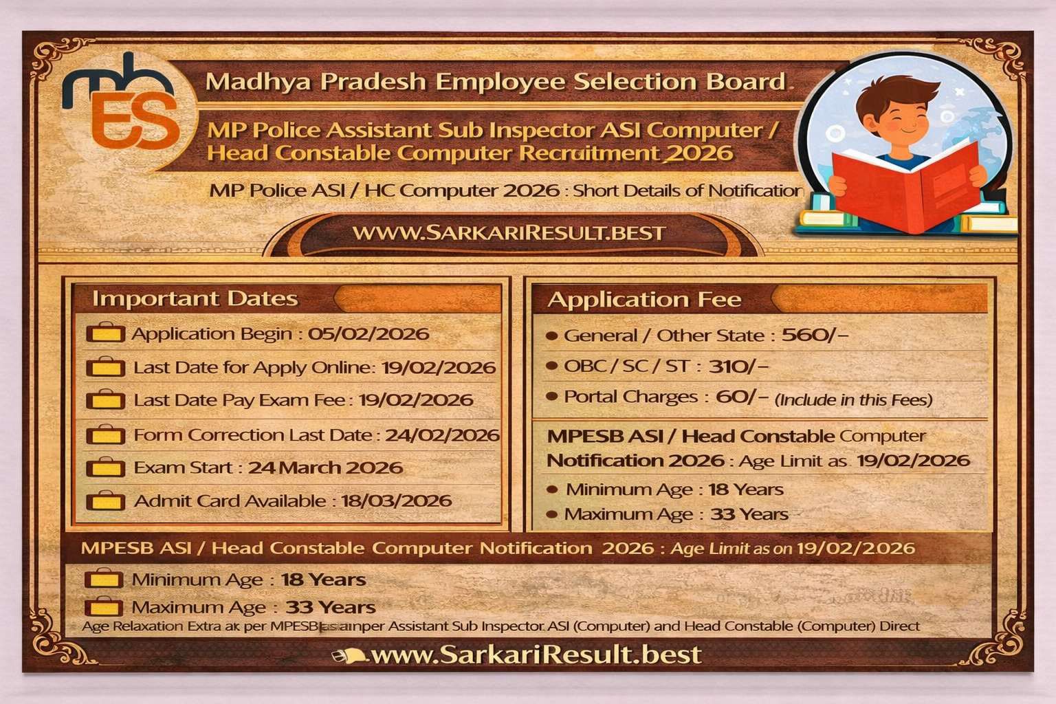 • Age Relaxation Extra as per MPESB Assistant Sub Inspector ASI (Computer) and Head Constable (Computer) Direct Recruitment Test For Police H.Q., Home (Police) -2026 Recruitment Rules .