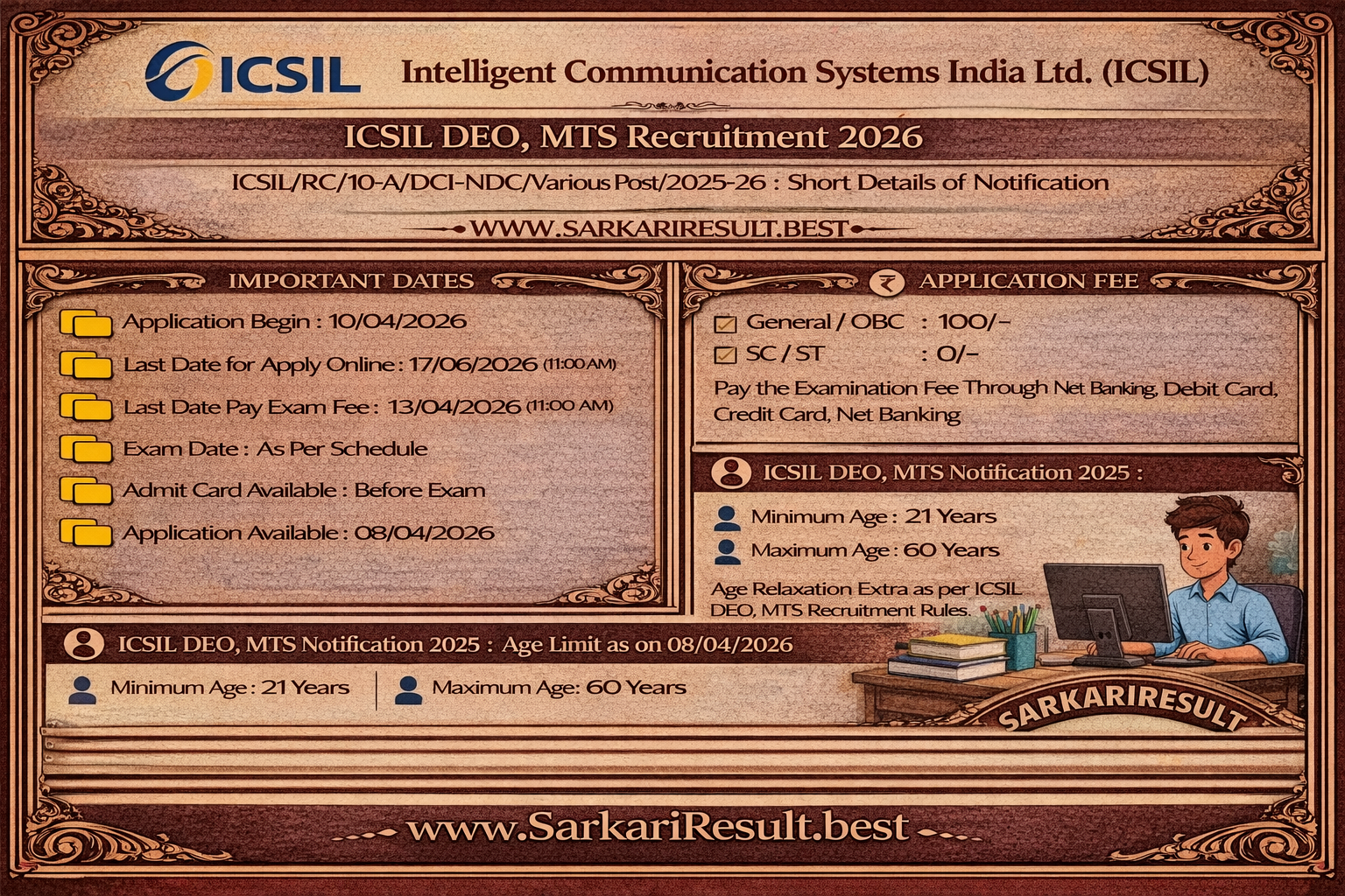 - For the latest updates on Sarkari Result, admit card, answer key, and result, always visit SarkariResult.com, the official website for Sarkari Result in India (Since 2012).ICSIL DEO MTS Online Form 2026