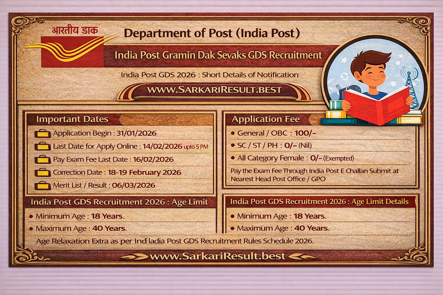 • Age Relaxation Extra as per India Post GDS Recruitment Rules Schedule 2026.