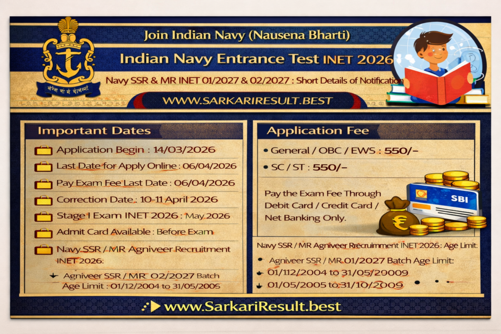 - Indian Navy SSR / MR INET 2026 Batch Agniveer Recruitment 2026 Notification Released. Candidate Can Apply Between 14/03/2026 to 06/04/2026.