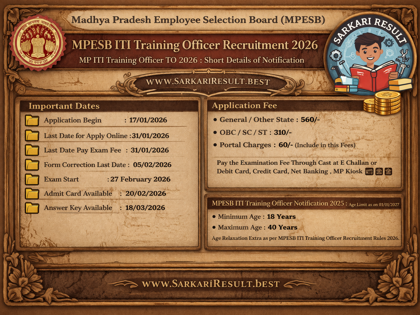 - Age Relaxation Extra as per MPESB ITI Training Officer Recruitment Rules 2026.