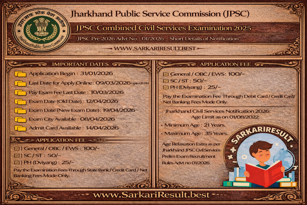 - Age Relaxation Extra as per Jharkhand JPSC Civil Services Prelim Exam Recruitment Rules Advt no 01/2026.