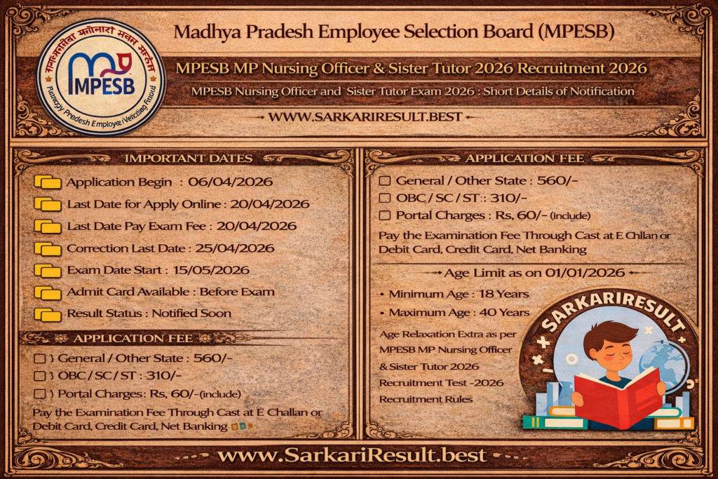 - Age Relaxation Extra as per MPESB MP Nursing Officer & Sister Tutor 2026 Recruitment Test -2026 Recruitment Rules.