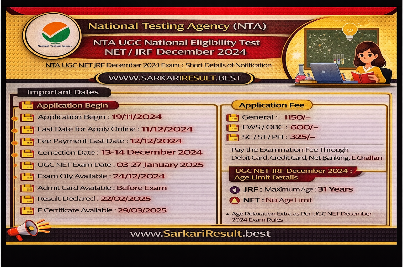 NTA UGC NET JRF December 2024 Exam : Short Details of Notification