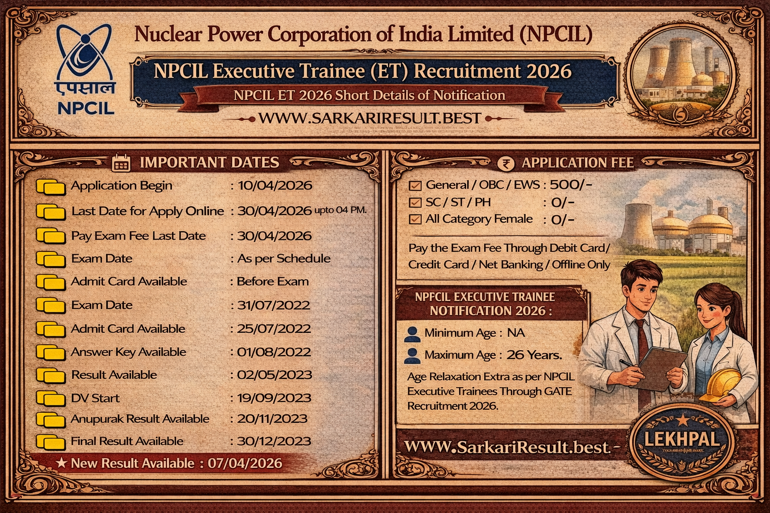 - For the latest updates on Sarkari Result, admit card, answer key, and result, always visit SarkariResult.com, the official website for Sarkari Result in India (Since 2012).NPCIL Executive Trainee (ET) Recruitment 2026