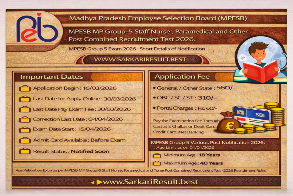 - Age Relaxation Extra as per MPESB MP Group-5 Staff Nurse , Paramedical and Other Post Combined Recruitment Test -2026 Recruitment Rules.