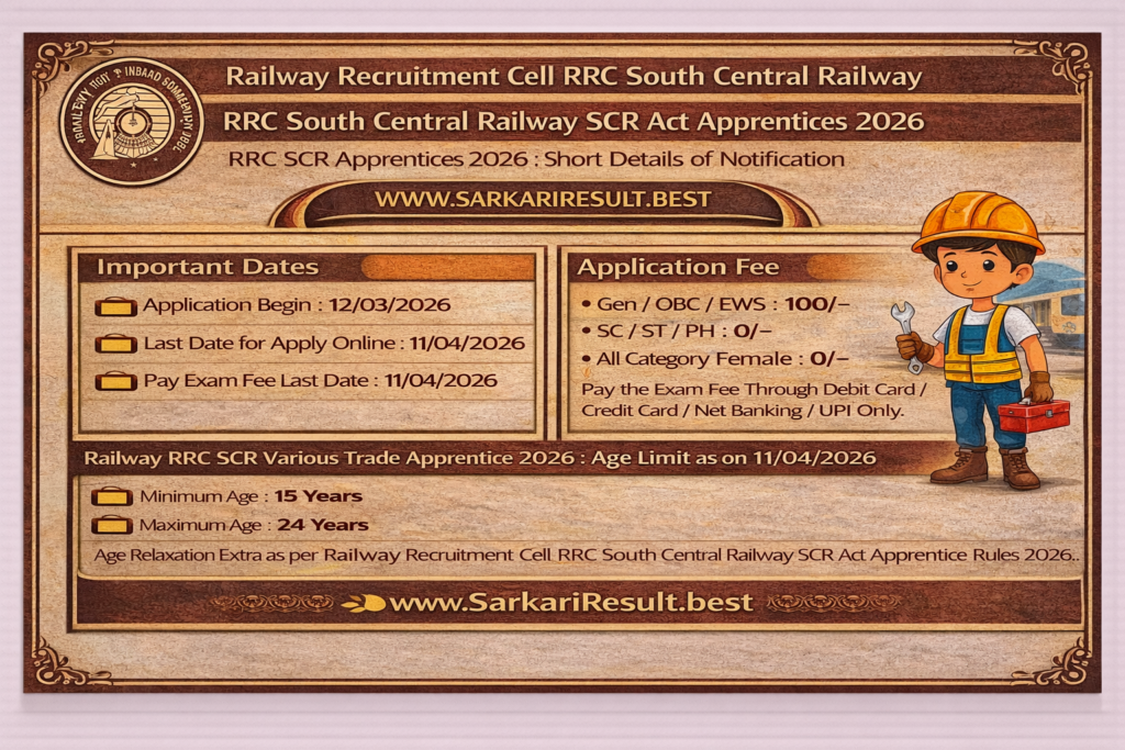 - Age Relaxation Extra as per Railway Recruitment Cell RRC South Central Railway SCR Act Apprentice Rules 2026..