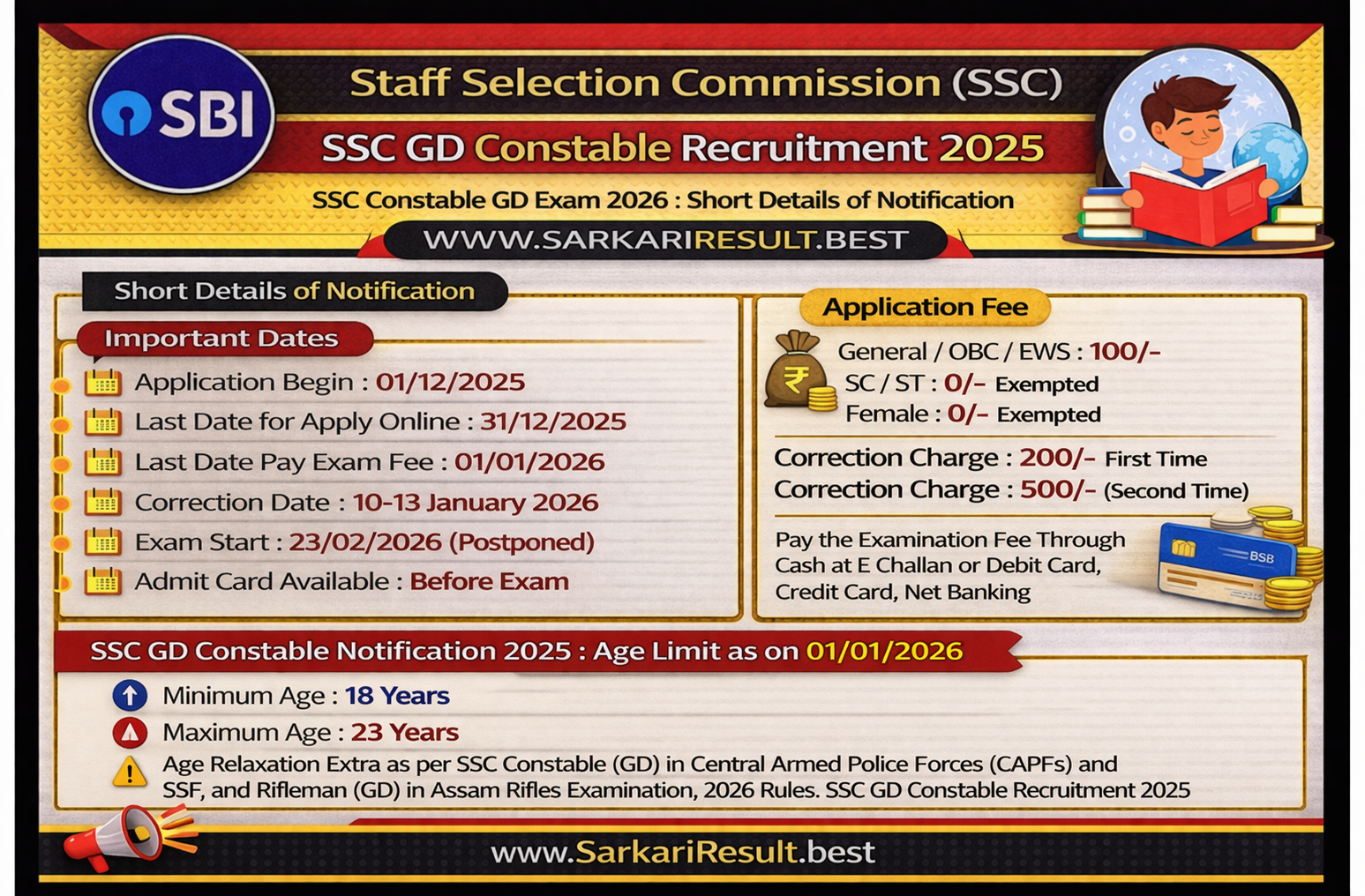 - SSC GD Constable Recruitment for Various Post Candidate Can Apply Between 01/12/2025 to 31/12/2025