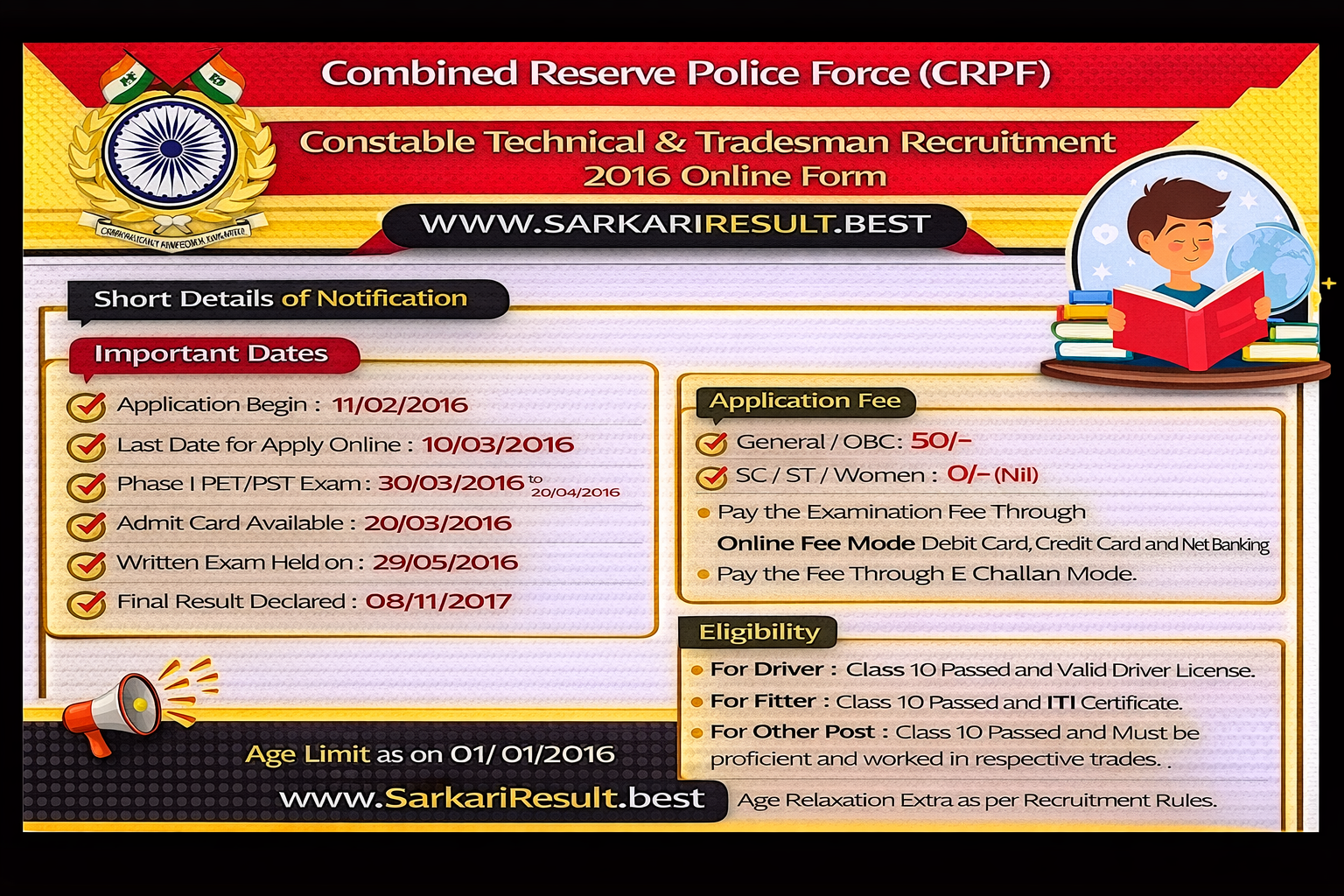 • For Other Post : Class 10 Passed and Must be proficient and worked in respective trades. , Tradesman Recruitment 2016 Online Form
