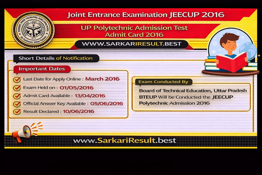 - Board of Technical Education, Uttar Pradesh BTEUP Will be Conducted the JEECUP Polytechnic Admission 2016