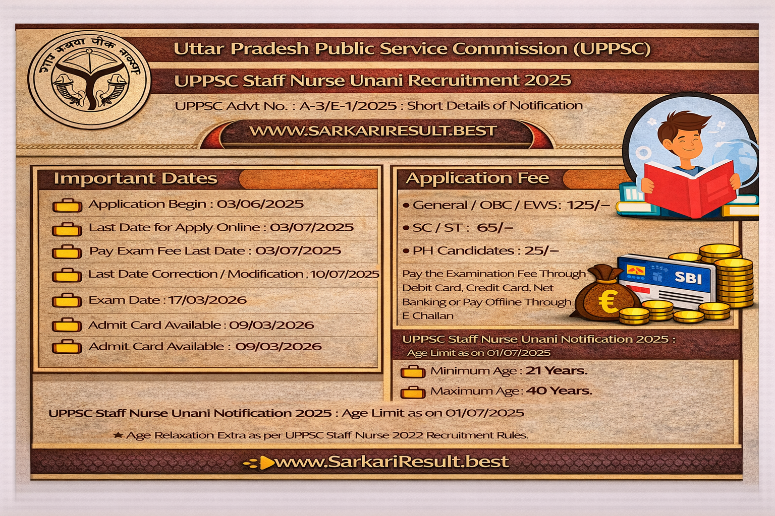 - Uttar Pradesh Public Service Commission UPPSC Call For New Application for Uttar Pradesh UPPSC Staff Nurse Unani Recruitment Advertisement Recruitment 2025 Candidate Can Apply Between 03/06/2025 to 03/07/2025