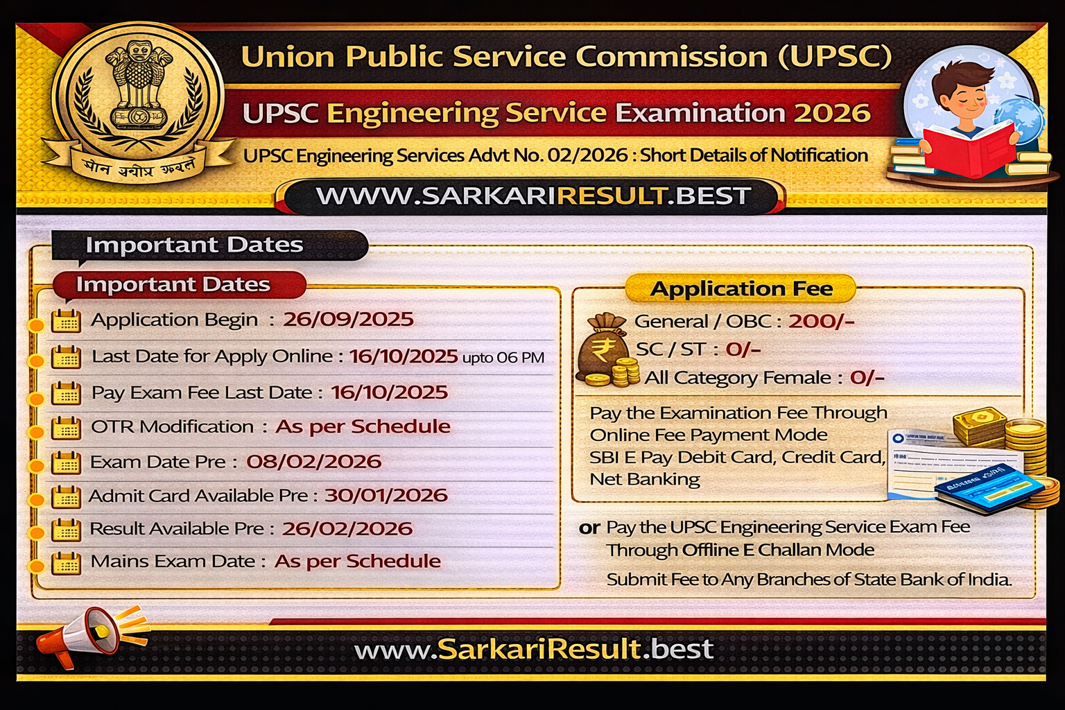 - Union Public Service Commission UPSC Engineering Services 2025 Examination. Candidate Can Apply Between 26/09/2025 to 16/10/2025