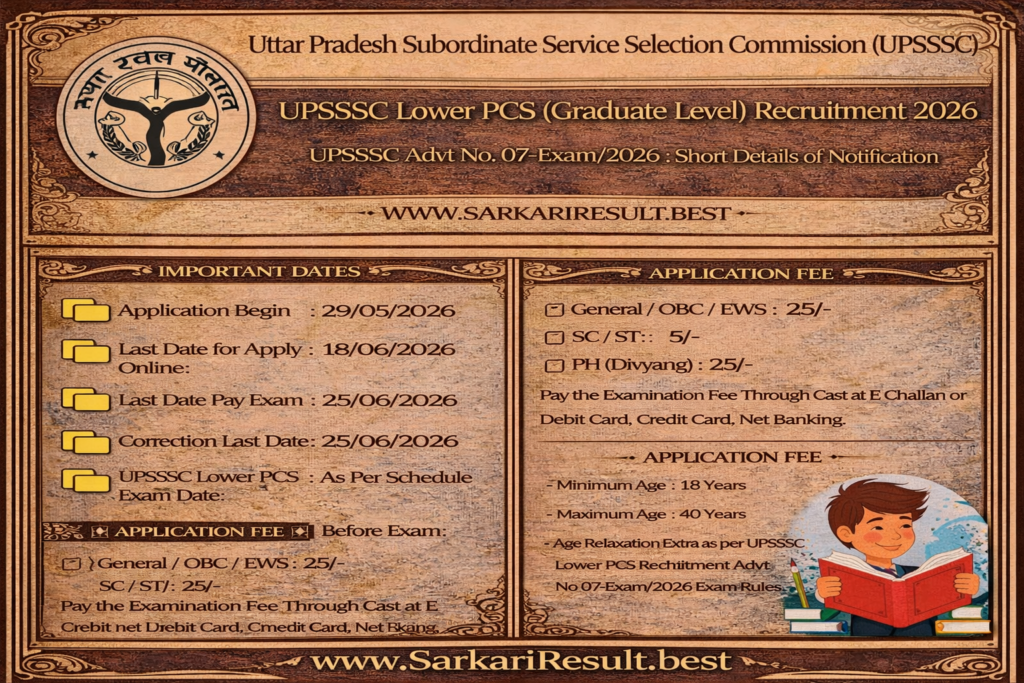 - Age Relaxation Extra as per UPSSSC Lower PCS Recruitment Advt No 07-Exam/2026 Exam Rules.UPSSSC Lower PCS Graduate Level Online Form 2026