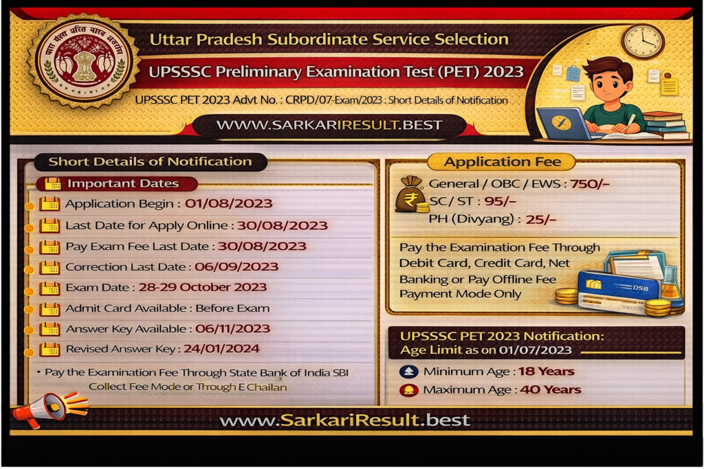UPSSSC PET 2023 Advt No. : 07-Exam/2023 Short Details of Notification